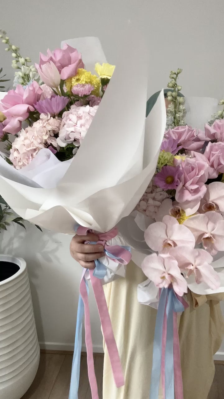 Wrapped in soft white paper and finished with flowing blush and sky blue ribbons, this bouquet feels light, dreamy, and effortlessly elegant.